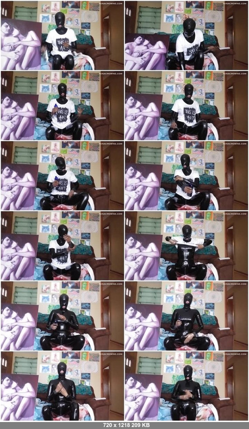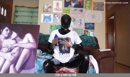 Fully encased in latex, I give an interview about my art. I show off some of my work, talk about what art means to me, and why I create what I do. Throughout the video, I lube up my catsuit, hood and gloves, making them very shiny. I even soak my t-shirt in lube, much like a wet t-shirt contest. This is a great video for people who love latex and/or who want to know more about the paintings and drawings I create.