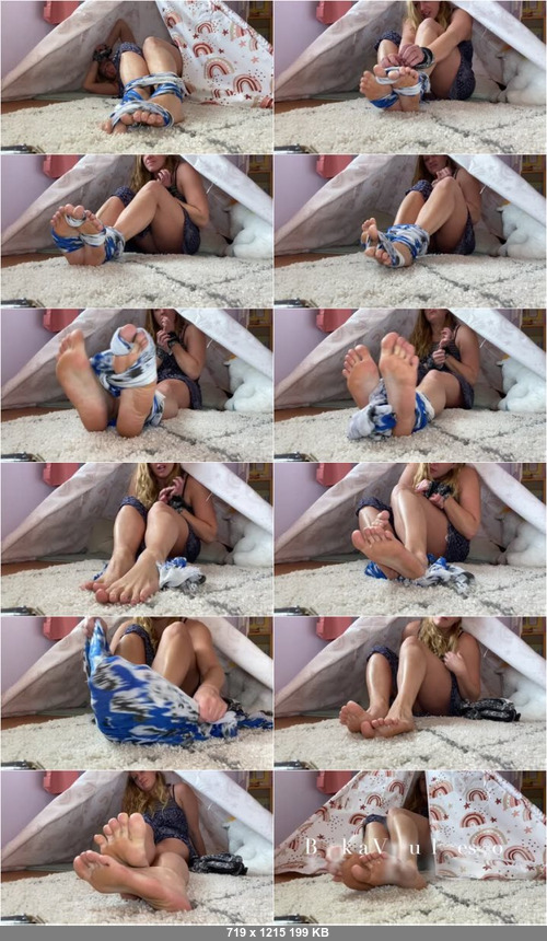 It would seem that you have not done as good of a job as you thought when tying up Goddess Michelle. She struggles briefly, but ultimately frees herself from the scarves you used to tie her up with. Better luck next time.