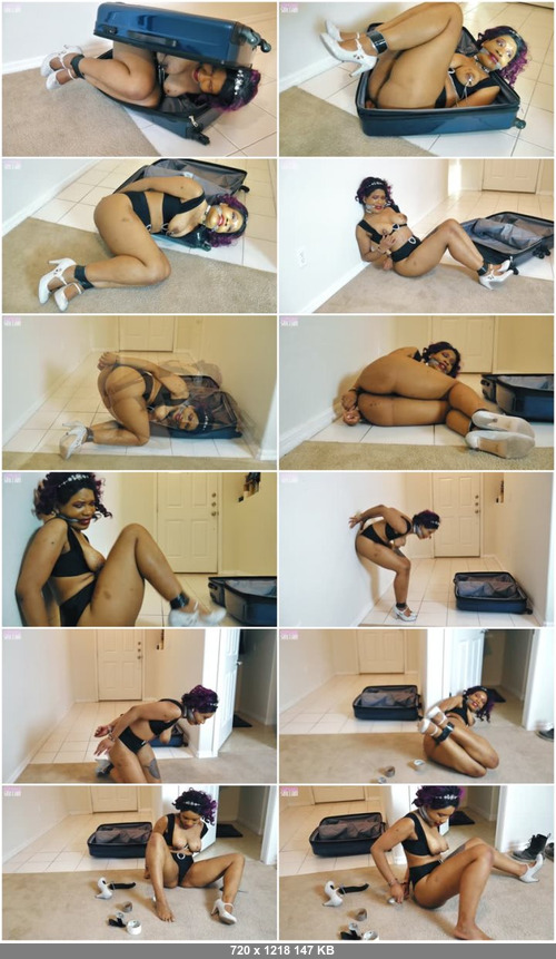 Watch as a swimsuit model comes to...in a suitcase! Handcuffed, cleave gagged with tape, and her ankles bound with tape, she struggles out of the suitcase and then struggles to escape! Take in her tight swimsuit, her tits clamped, and her cute ass as she wiggles and tries to figure out what is going on. Perhaps her nabber didn't anticipate her coming to so soon, because she spots scissors and keys only a few inches away! Removing her heels and using her toes to grab the keys she unlocks the handcuffs, giving her a chance to escape...